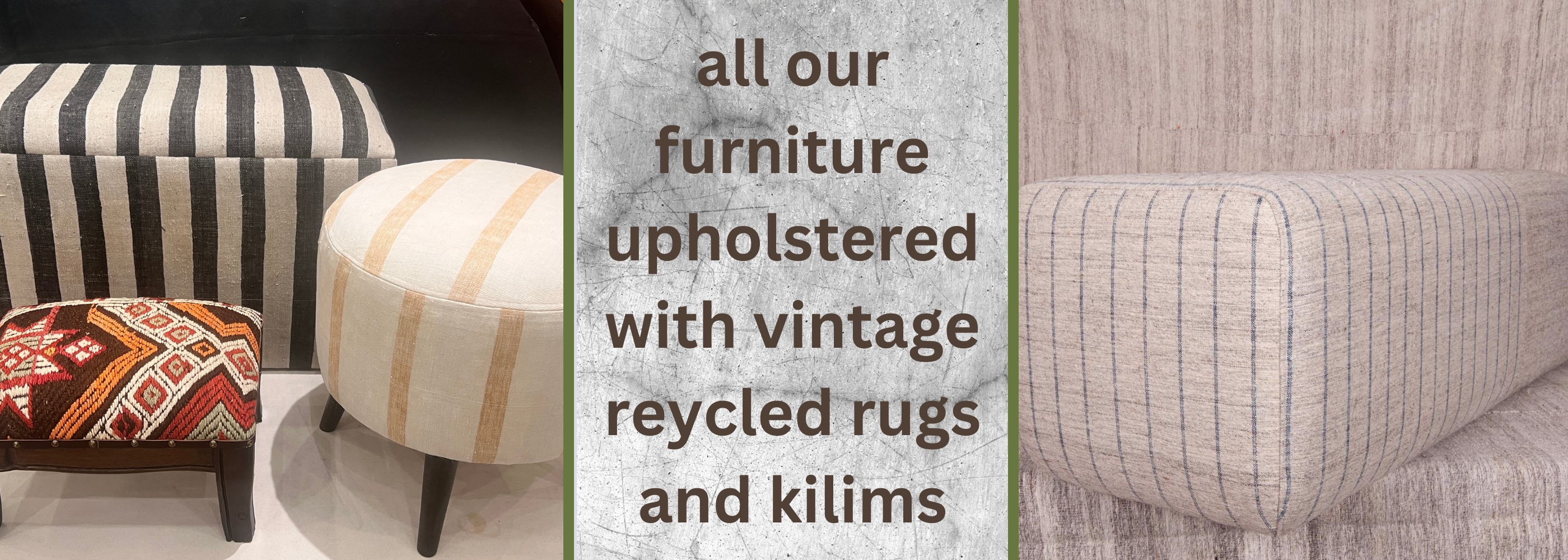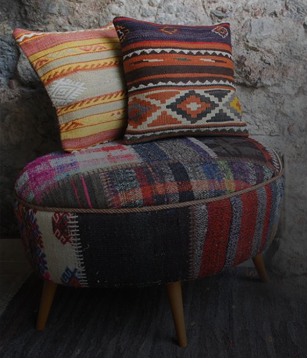 My first revolutionary idea was to recycle vintage fabric and turn them in to home goods such as ottomans, benches, pillows and chairs.I am using textile from all over the world from Afrika to Asia.Many of the products upholstered with kilim ( traditional pileless rugs).